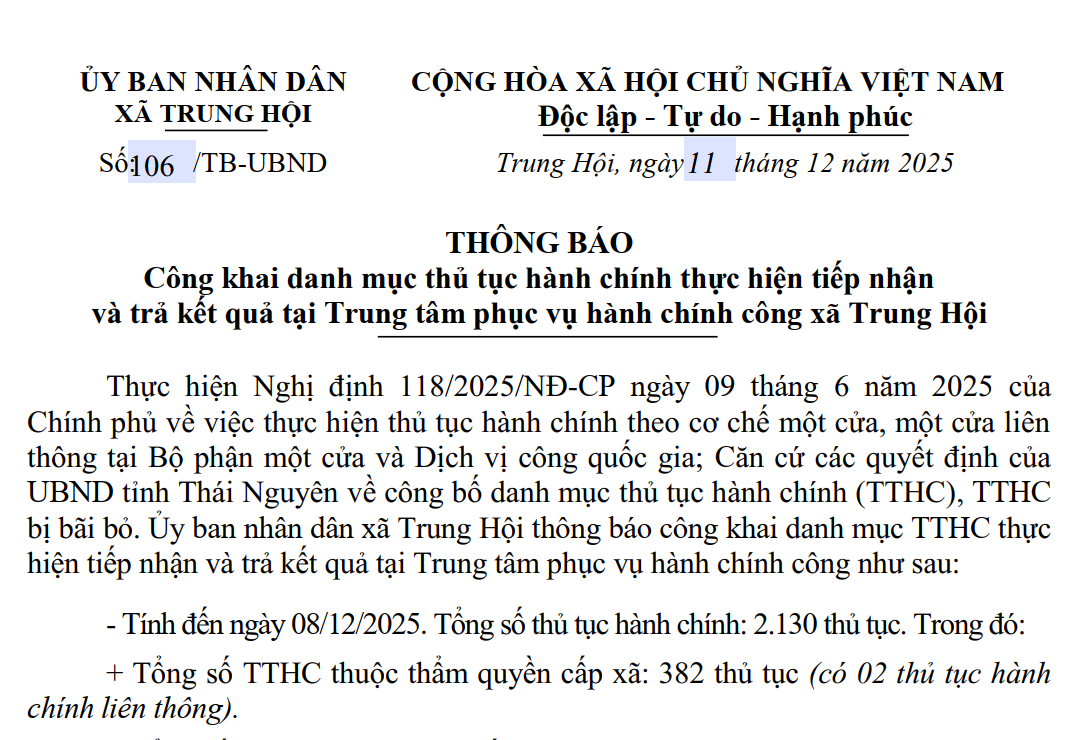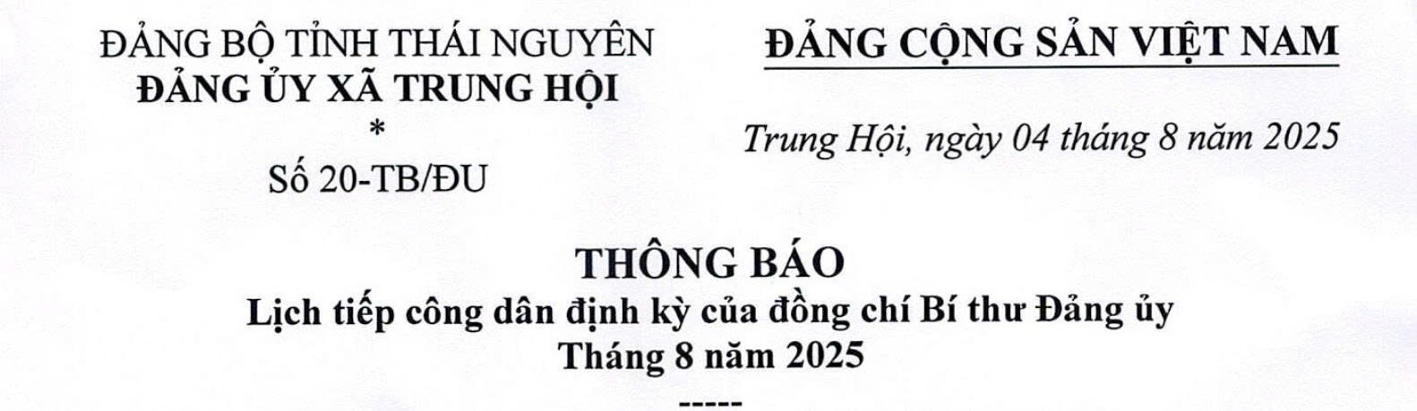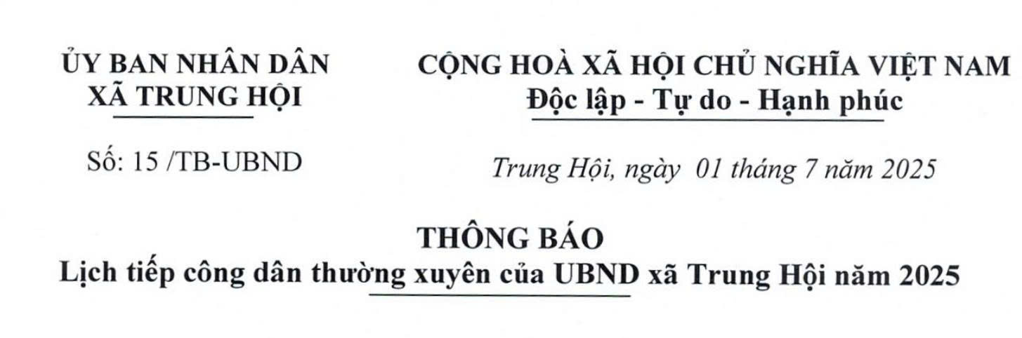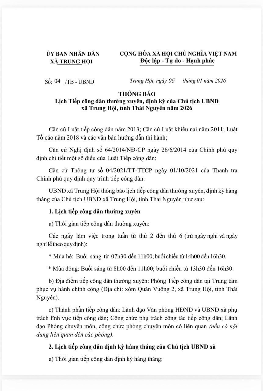 THÔNG BÁO Lịch Tiếp công dân thường xuyên, định kỳ của Chủ tịch UBND xã Trung Hội, tỉnh Thái Nguyên năm 2026