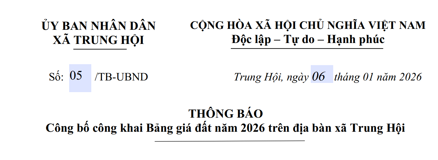 Công khai bảng giá đất năm 2026 trên địa bàn xã Trung Hội